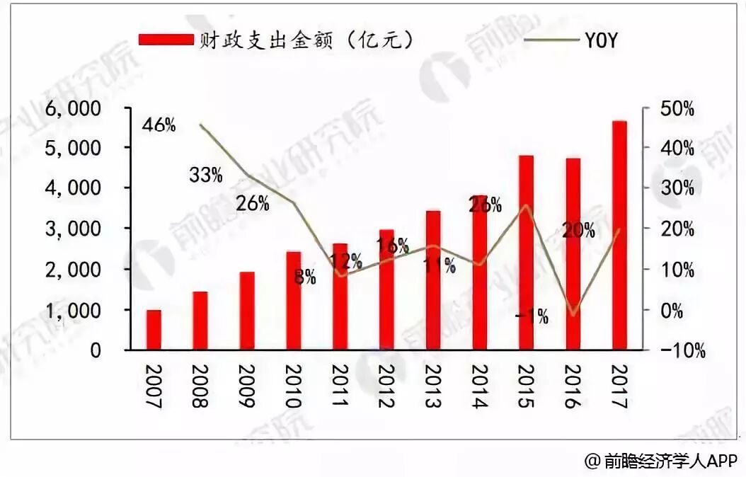 2017年起全国公共财政支出预算中节能环保支出再次快速增长,环保行业财政支出占GDP比重提升。据前瞻产业研究院发布的《环保行业发展前景与投资预测分析报告》数据显示,全国每年环保财政支出金额达数千亿元,政府环保行业财政投资也在不断增加,2017年环保行业公共财政支出达5672亿元,同比增速高达20%,
